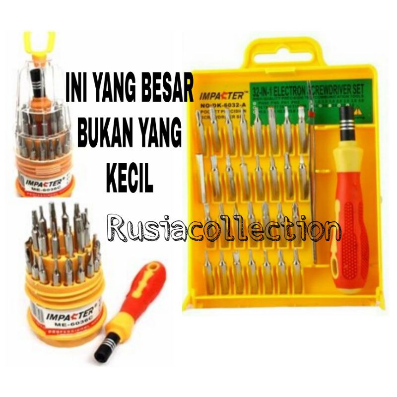 TOOLS INI HARUS ANDA PUNYAI DI RUMAH!Dengan obeng 32 dalam 1 set ini kamu tidak lagi pusing cari atau pinjam obeng tetangga.Mau betulin apa saja jadi lebih mudah dan tidak repot.Obeng ini sangat cocok untuk bongkar-bongkar peralatan kecil atau elektronik seperti HP, laptop, PC, Android, Televisi, DVD Player dll.Technical DetailsMemiliki 30 Jenis Obeng dari yang Besar sampe yang Terkecil dan ber-Magnet sehingga memudahkan sekali untuk pengerjaan pada sekrup kecil.Pekerjaan Rumah tidak Repot lagi, tidak perlu mencari-cari Obeng dengan jenis tertentu, cukup 1 alat semua teratasi.Kuat dan Kokoh tidak gampang Rusak !!Bentuknya Simple, Handy dan Praktis, mudah untuk dibawa kemanapun (Persiapan saat Berkendara, di Rumah, di Kantor dll).NB : Tidak ada garansi untuk kemasan karena, bahan kemasan mika yang rentan saat pengirimanMembeli berarti setuju dengan ketentuan iniNo retur, No Compla