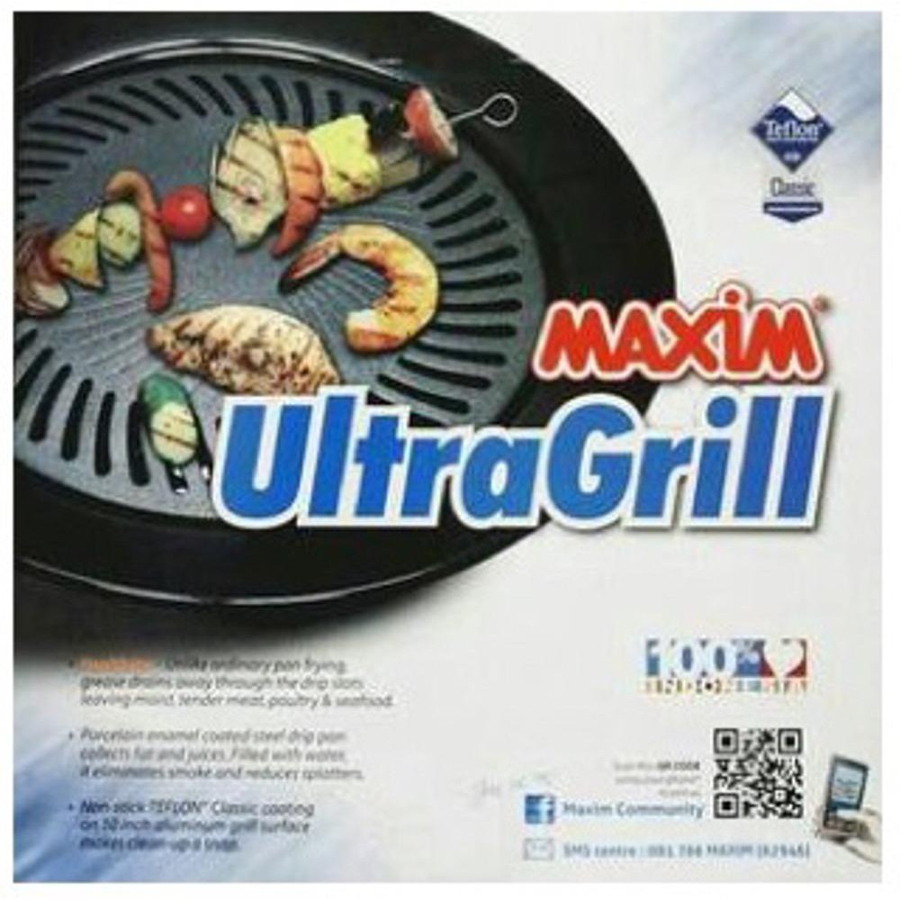 Ultra Grill Maxim- Bagian pemanggang berlapis teflon anti lengket- memanggang dengan sehat, karena minyak akan jatuh kebawah- menanggang dengan rata- bagian bawah dilapisi dengan porcelain enamel- diameter keseluruhan 34cm- diameter grill dalam