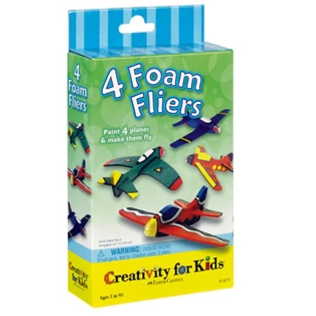 "Permainan merakit dan mewarnai pesawat.Terdiri dari : - 4 bagian pesawat berbahan styrofoam dengan lebar sayap 18 cm. - 4 klip plastik bagian hidung pesawat.- 4 warna cat (hitam, biru, merah, kuning serta k