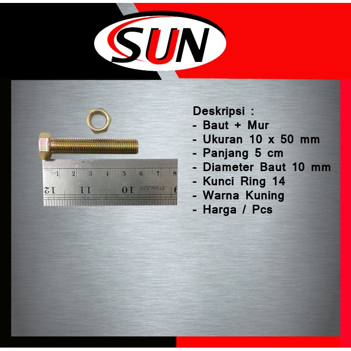 Deskripsi :- Baut + Mur- Ukuran 10 x 50 mm- Panjang 5 cm- Diameter Baut 10 mm- Kunci Mur Ukuran 14 mm- Harga / Pcs Biji--------------------------------------------------------------------------------------------------------------Salam,Sun har