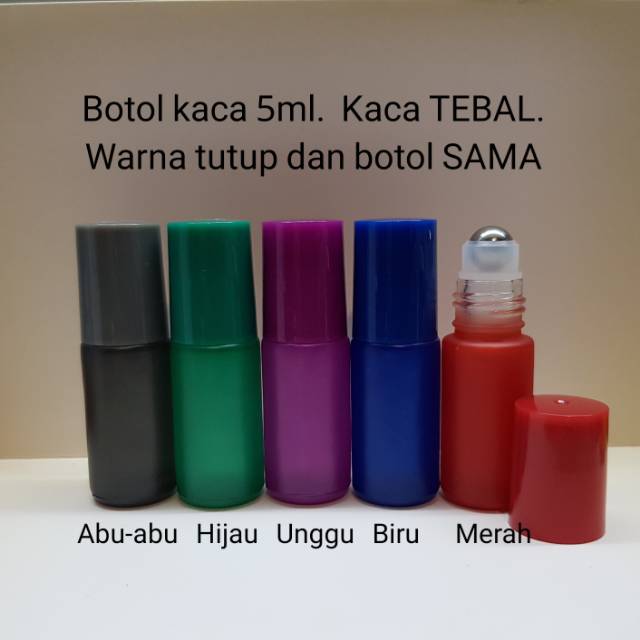 Koleksi terbaru!!Botol kaca roll on 5ml dengan warna tutup SAMA, sehingga makin memudahkan pencarian essential oil kesayangan.Bola roll on stainless steel dengan dudukan plastik transparan. Kaca TEBAL yang telah dilapisi 2x dan diberi efek frosted, sehingga warna tidak mudah memudar/lepas.Warna juga lebih opaque yang berefek lebih gelap untuk menjaga mutu oil.Mohon diperhatikan untuk botol jenis ini, warna tidak sampai bagian atas botol.Tersedia dalam 5 warnaAbu-abu Hijau Unggu Biru Merah Tolong cantumkan warna yang diinginkan. Bila tidak ada keterangan, kami akan kirim secara acak. Terima k