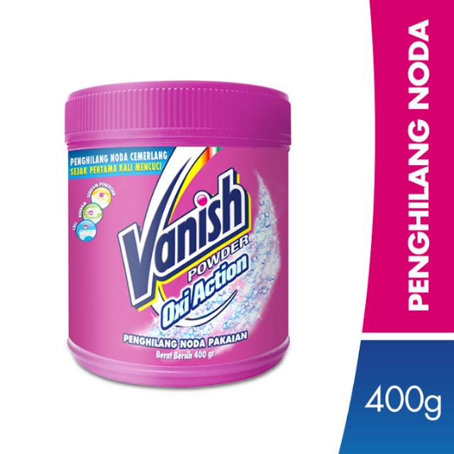 Vanish OXI ACTION Powder 400gVanish OXI ACTION Powder merupakan detergen bubuk yang efektif menghilangkan noda pada pakaian yang sulit dibersihkan seperti noda saus, lumpur, lipstik, dan keringat, sejak pertama kali mencuci. Diformulasikan dengan Super Power Lift Agents, Vanish bekerja menghilangkan noda membandel dengan cepat tanpa perlu menggosok berlebihan atau menyikat. Tak hanya itu, formula bahan aktifnya yang tidak merusak serat kain menjadikan Vanish aman digunakan untuk pakaian berwarna, putih, dan pakaian halus. Berikan keluarga tercinta pakaian selalu bersih cemerlang dan bebas noda dengan membersihkannya menggunakan Vanish OXI ACTION Powder.Detail:- Detergen bubuk- Mampu menghilangkan noda pada pakaian yang sulit- Diformulasikan dengan Super Power Lift Agents- Mengandung bahan aktif yang tidak merusak serat kain- Memiliki wangi yang tahan lama- Menjaga warna pakaian tetap cemerlang- Aman digunakan untuk pakaian berwarna, putih, dan pakaian halus- Tidak panas di tangan- Ramah lingkungan- Isi 4