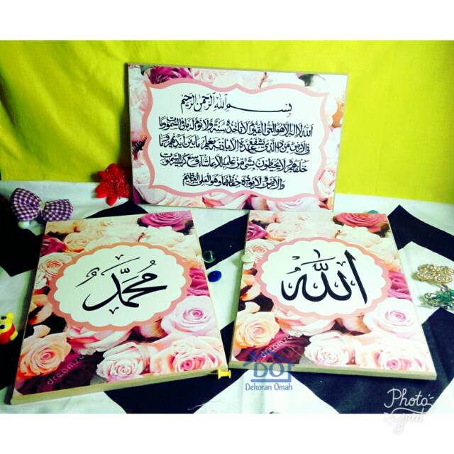 Kami adalah Produsen Home Decor Kota Malang dengan brand DEKORAN OMAH✔ 100% Produksi sendiri ✔ Bagi yang ingin desain sendiri atau hanya rubah warna/tulisan/desain WAJIB gunakan lapak custom jangan yang ini!✔ Reseller and Dropshiper are welcome ✔ Untuk walldecor tidak perlu bertanya Ready atau Tidak sihlakan langsung order saja kecuali lapak yang ada tulisan Custom / POSPESIFIKASI PRODUK✔ 1 set 3 pcs✔ Ukuran Allah Muhammad + Ayat Kursi 30cm x 20cm✔ Bahan papan MDF lapis stiker dicetak menggunakan mesin cetak kualitas Premium ditambah dengan Laminasi doff supaya hasil maksimal dan warna semakin awet✔ Tinggal dicantolkan ke tembok atau dipajang✔ Packing bubble wrap + kasih stiker fragileLihat Seluruh Produk Kami : klik ==> #DOItem <==Lihat produk kami berdasarkan kategori Kaligrafi : klik ==> #DOKaligraf
