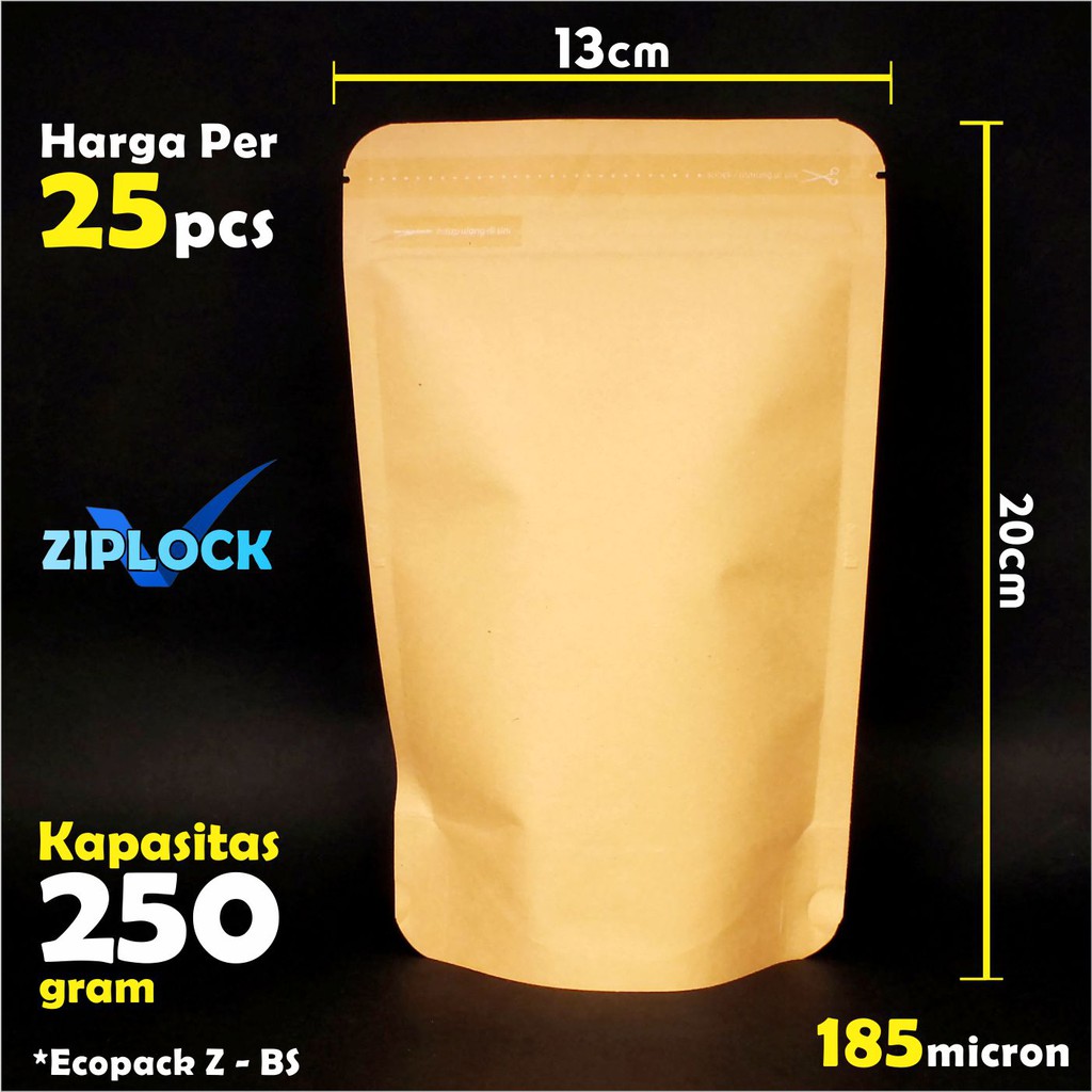 *Ecopack Z-BS- 250 gramKemasan Stand Up Pouch Kertas Klip Zipper Ziplock - Ecopack 250 gramKemasan stand pouch Kertas dan aluminium foil dapat berdiri menjadi lebih cantik dan menarik.Bahan aluminium foil di bagian dalam dan Kertas coklat di luar. Membuat packing kemasan produk anda menjadi sangat cantik dan menarik,Dilengkapi zipper/klip/ziplock yang mempermudah anda untuk membuka dan menutup kembali dengan rapat. Dilengkapi dengan bagian untuk menyobek , memudahkan anda saat tidak ada benda untuk menyobek.Spesifikasi Barang :- Kode : Ecopack Z-BS- 250 gram- Model : stand pouch / stand up- Warna Depan : coklat- Warna Belakang : coklat- Ukuran : 13 cm x 20 cm- Ukuran Alas : 6,5 cm- Kapasitas : 250 gram / ml (pengukur gram gula pasir / ml air)- Tebal : 185 micron- Bahan : Foodgrade- Harga : per 25 pcsSangat cocok buat kemasan produk UKM seperti :Kemasan bubukKemasan snackKemasan cairdan kemasan lainnyajika kurang tau untuk besar volume yang dibutuh kan silakan cek dengan cara :1. Pengukuran kemasan kita menggunakan gula untuk gram dan air untuk mililiter,2. Ukur berat gula pasir / air sesuai berat kemasana,3. Bandingkan gula paris / air yang telah di ukur, dengan produk anda,4. Sesuaikan dengan kemasan yang cocok untuk produk anda,5. Silakan pesan dengan ukuran stand pounh yang anda pilih.Keterangan : - Harga di atas untuk per 25 pcs- Barang yang sudah dibeli tidak dapat dikembalikan ataupun ditukar. Jadikan pastikan dengan benar ukuran mana yang akan Anda